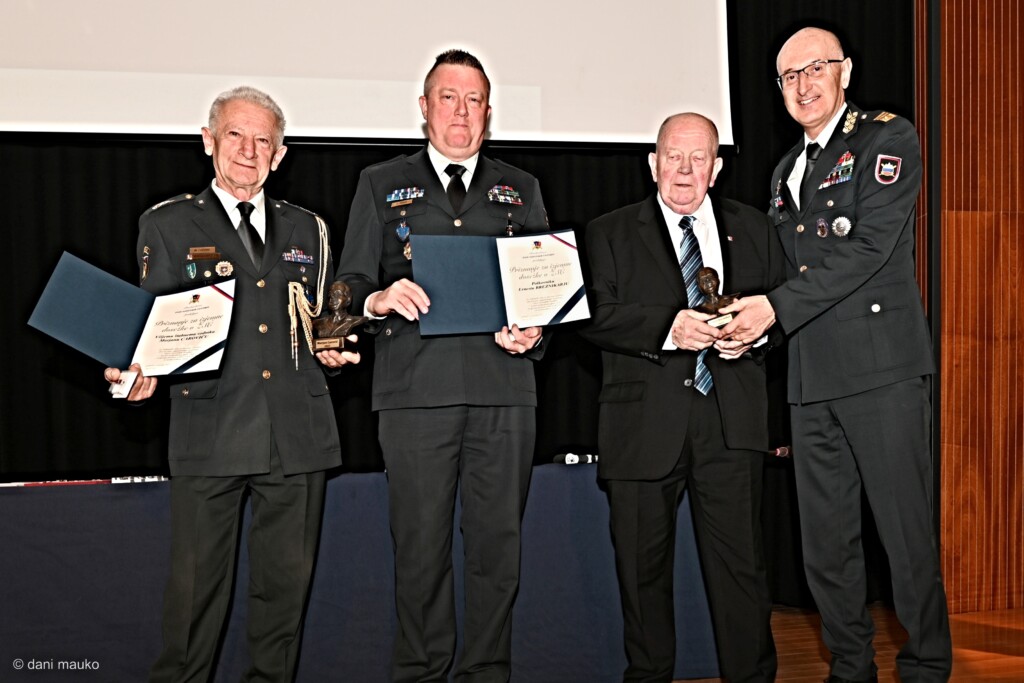 Najvišje priznanje Zveze slovenskih častnikov – kipec generala Ivana Dolničarja sta prejela (z leve) štabni vodnik Marjan Carovič iz OZSČ Ljutomer, Jurij Erzar, ter polkovnik Ernest Breznikar iz OZSČ Krško, Dobran Božič. Častne znake Zveze slovenskih častnikov so prejeli mag. Boštjan Pavlin, državni sekretar na Ministrstvu za obrambo, polkovnik Branko Podbrežnik, poveljnik Poveljstva prostorskih sil Slovenske vojske, polkovnik Gregor Vodeb, poveljnik 1. brigade Slovenske vojske in podpolkovnik Marko Volovlek iz 8. TERP-a.