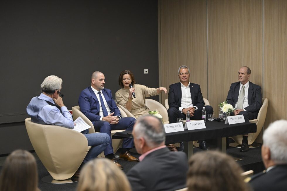 Z leve moderator Slavko Bobovnik, mag. Boštjan Pavlin, državni sekretar na ministrstvu za obrambo Republike Slovenije, mag. Tanja Fajon, ministrica za zunanje in evropske zadeve Republike Slovenije, Saša Arsenović, župam Mestne občine Maribor in Aleš Gregorc, dekan Fakultete za kmetijstvo in biosistemske vede Univerze Maribor.
